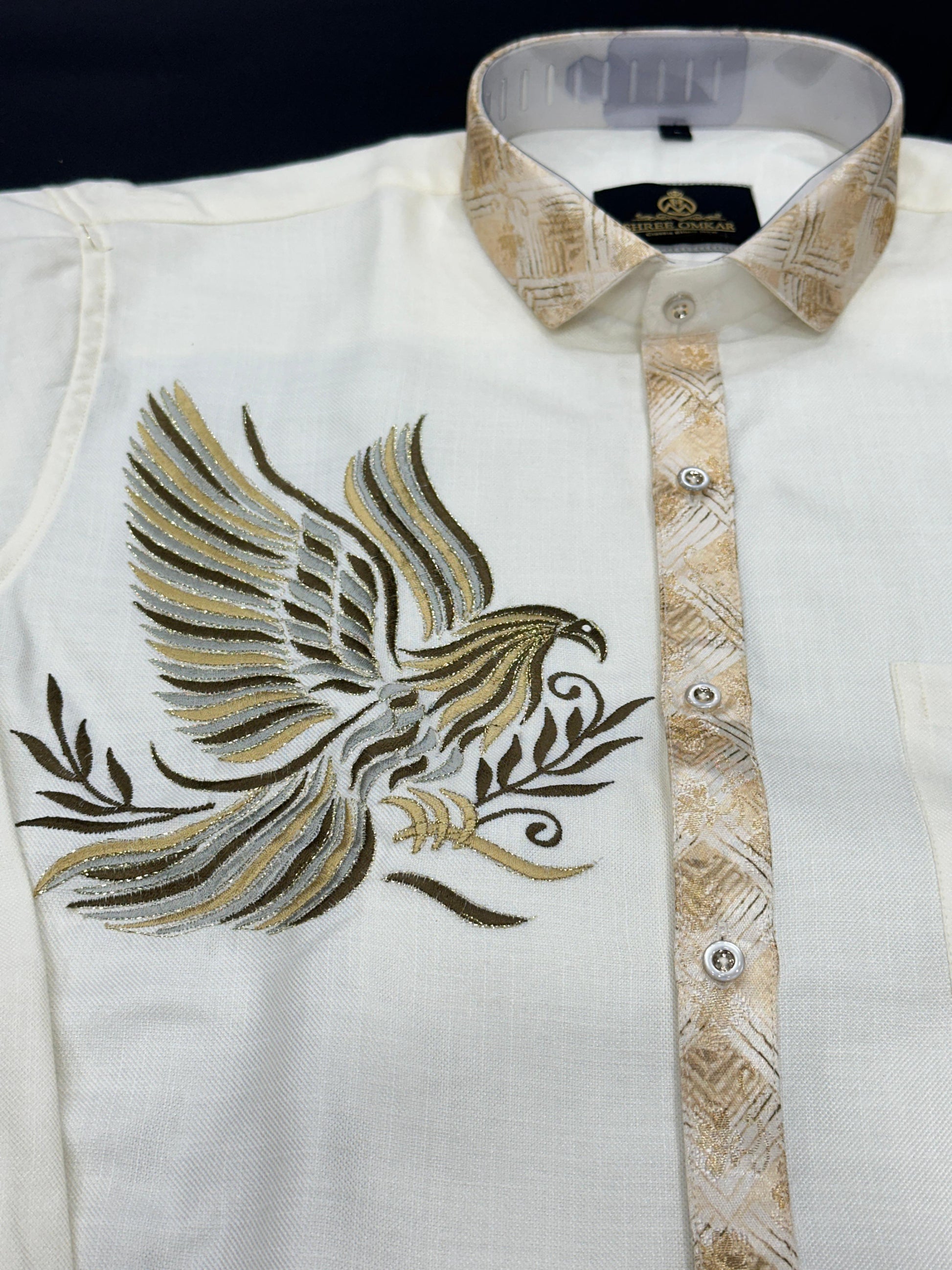 Product Name: Cream Eagle Embroidery Designer Shirt – By Shree Omkar