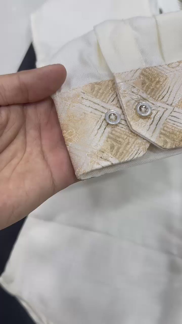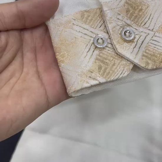 What makes this shirt stand out is the contrasting printed fabric on the collar, cuffs, and placket – a perfect balance of detail and minimalism. The slim-fit tailoring and full sleeves offer a sharp and modern silhouette, ideal for festive occasions, to stand out in any wedding , and statement daywear.