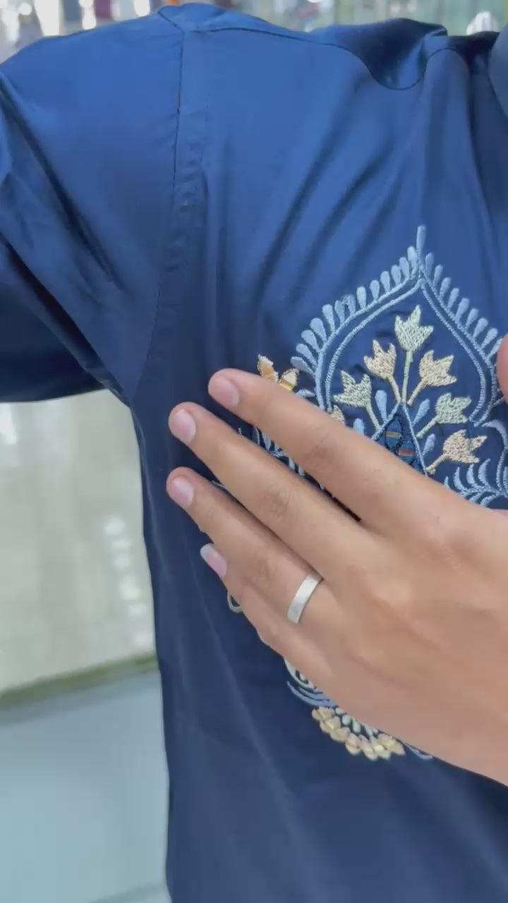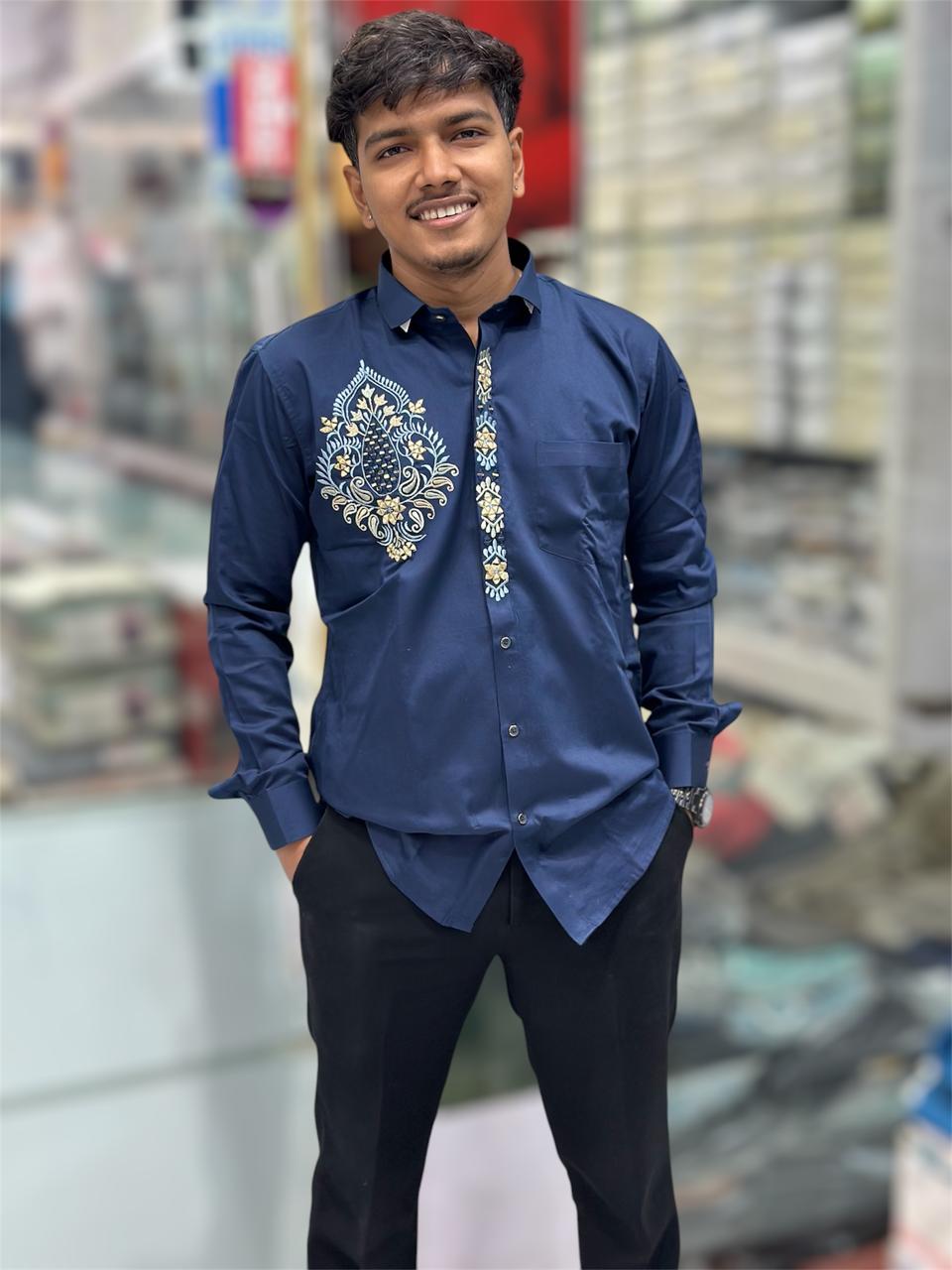 Upgrade your wardrobe with our Navy Blue Designer Jethalal Shirt, crafted from premium satin cotton for a luxurious feel. This full-sleeve designer shirt features intricate detailing on the button line and a stylish design on the right chest area, making it a standout piece for any occasion.